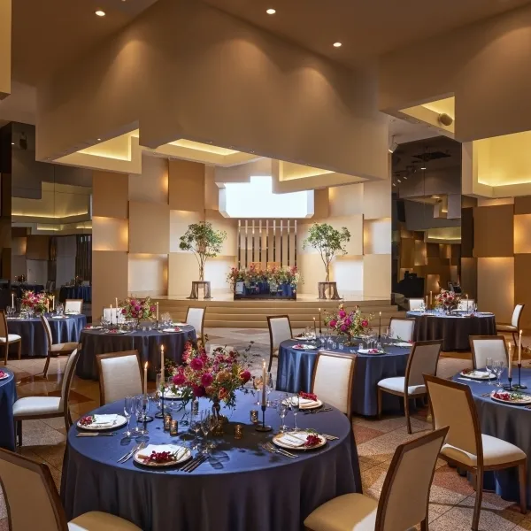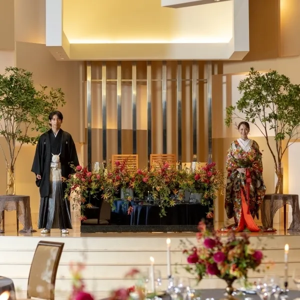 和をイメージさせる格子デザインの現代建築をイメージしたパーティ会場。美空間で叶えるワンランク上の上質ウエディング体験。オリジナル和装人前式や本格神殿での神前式もご提案